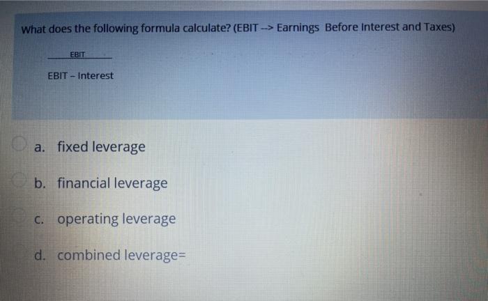 Formula Ebit : What Is Financial Leverage Definition Examples And Types Of Leverage Businessnovice Net : Maybe you would like to learn more about one of these?. We did not find results for: Check spelling or type a new query. Maybe you would like to learn more about one of these?