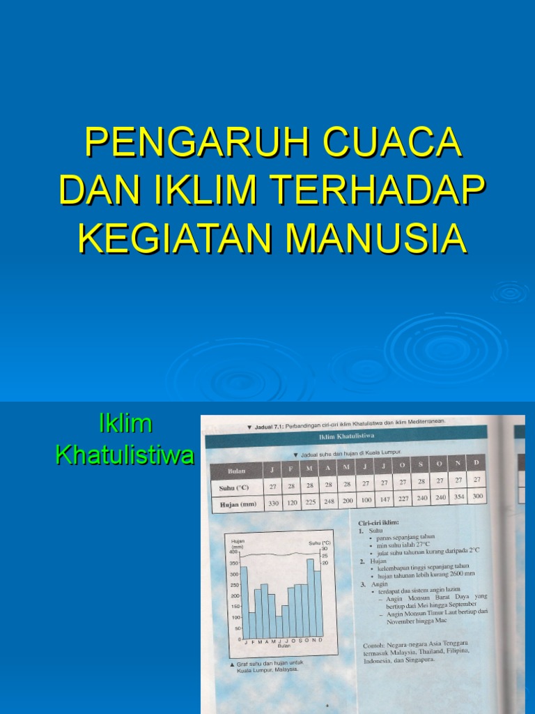 Dipagi hari sekitar jam 7 ke atas merasakan udara lembab atau terasa agak dingin di cuaca cerah berarti pada hari tersebut akan terjadi hujan. Hujan tersebut juga dikatakan sebagai hujan zenithal. Contoh negara lain yang mempunyai iklim yang sama ialah indonesia, brazil dan nigeria. Hujan turun tidak teratur dan tidak pernah lebat, c. Jenis hutan hujan tropis, ekosistem hutan hujan tropis.